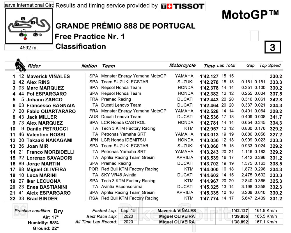 Η πρώτη περίοδος ελευθέρων δοκιμαστικών FP1 της κατηγορίας MotoGP του Πορτογαλικού Grand Prix είδε τον Marc Marquez να επιστρέφει στην πίστα 265 ημέρες μετά την τελευταία του εμφάνιση στην Jerez.