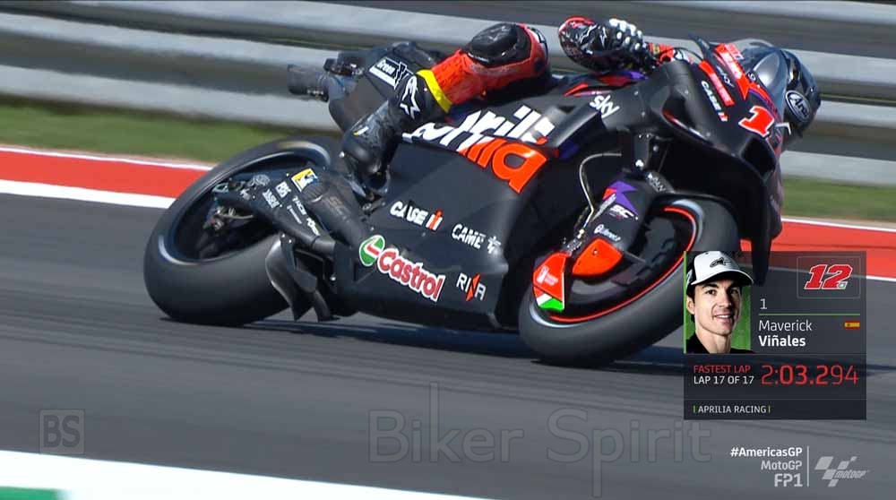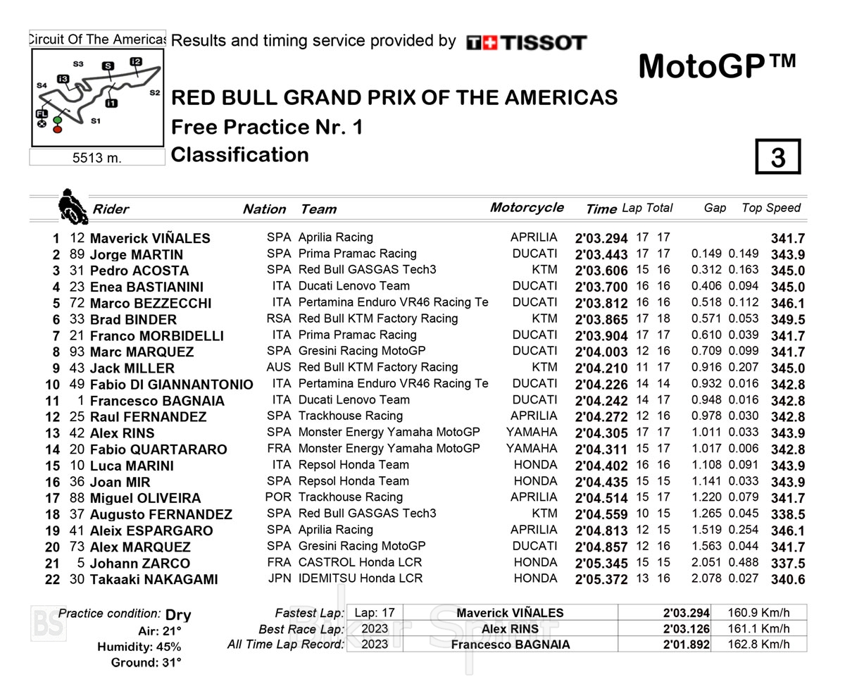 Στην πίστα του Austin, ο #12 πήρε το προβάδισμα με το Aprilia RS-GP του με χρόνο 2:03.294, μπροστά από τον ηγέτη του παγκοσμίου πρωταθλήματος Jorge Martin (Ducati Pramac) με 0,149 δευτερόλεπτα και τον πρωτάρη της GASGAS, Pedro Acosta με 0,312 δευτερόλεπτα (Team GASGAS Tech3 ).