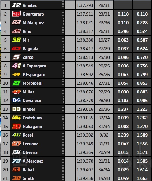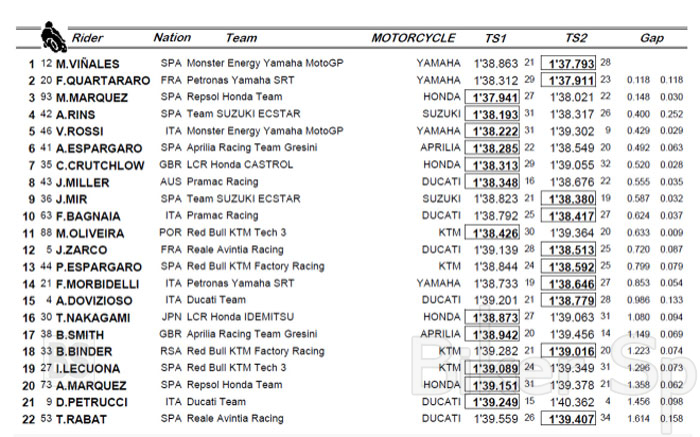 Οι αδελφοί Espargarò κλείνουν το Top Ten, με τον Aleix (Aprilia) μπροστά από τον Pol (KTM) και τον Franco Morbidelli. Η Ducati του Jack Miller και του Andrea Dovizioso καταλαμβάνουν την ενδέκατη και τη δωδέκατη θέση με διαφορά από την κορυφή των 0,883 και 0,9866 αντίστοιχα.