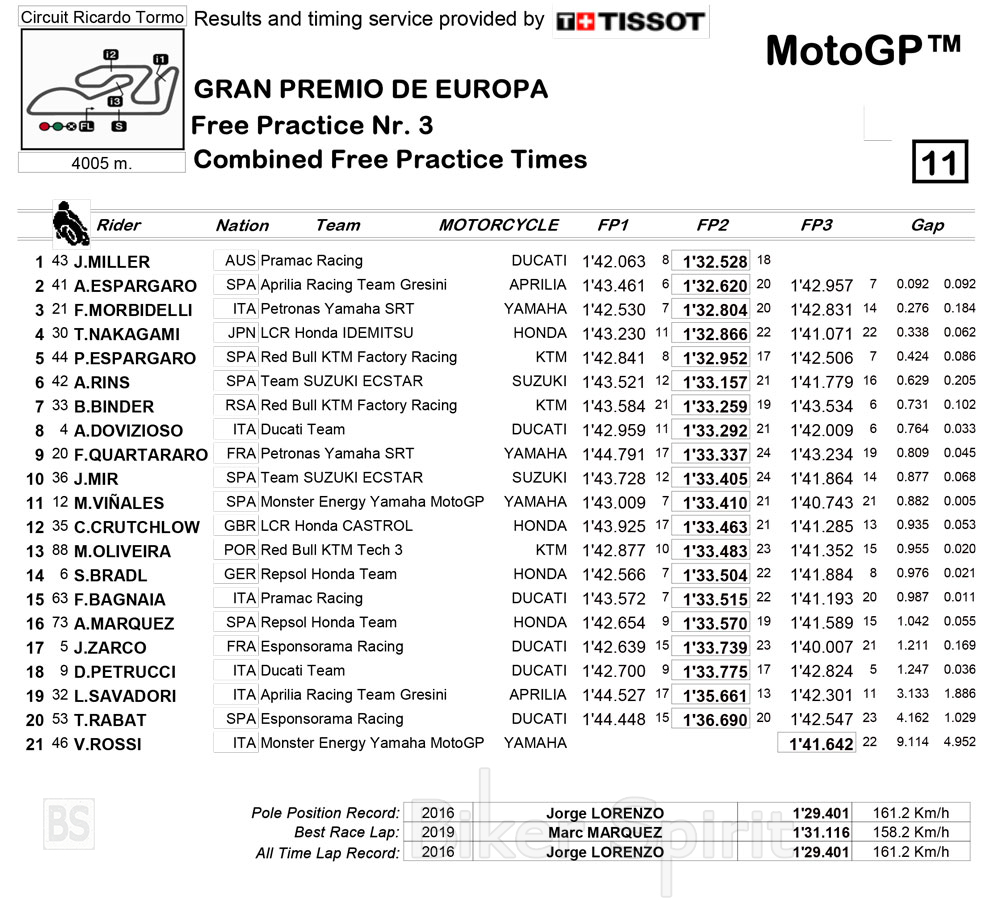 Με τους χρόνους που έγιναν χθες στο FP2 πηγαίνουν απευθείας στο Q2 οι: Miller, Aleix Espargarò, Morbidelli, Nakagami, Pol Espargarò, Rins, Binder, Dovizioso, Quartararo και Mir.