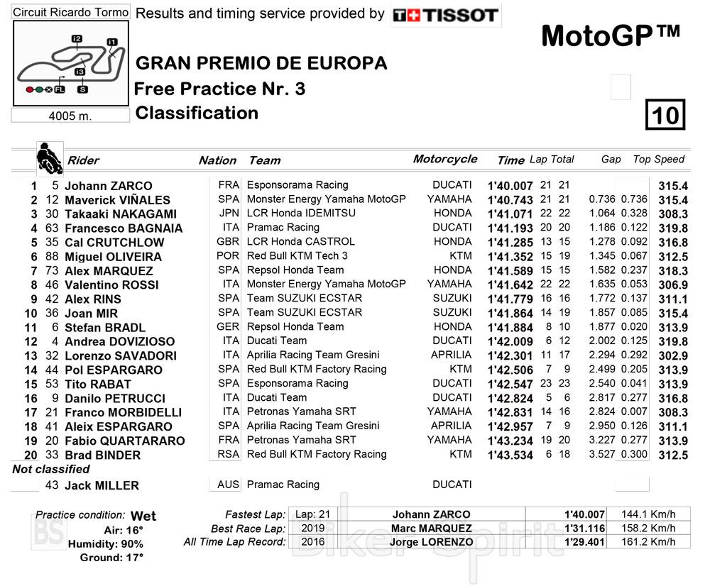 Οι αναβάτες της κατηγορίας MotoGP, συμπεριλαμβανομένου και του Valentino Rossi, που επέστρεψε, αφού είχε χάσει τους δύο αγώνες στο Aragon και τις χθεσινές ελεύθερες δοκιμές FP1 & FP2 λόγω του Covid-19, μπήκαν στην πίστα για το FP3 με ελαστικά βροχής.
