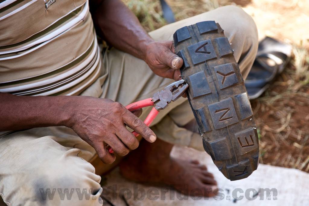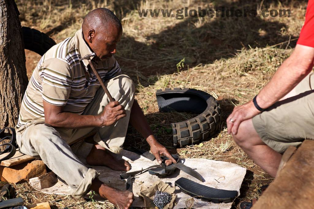 Στις φωτογραφίες που κοινοποιήθηκαν από τα μέλη στην σελίδα της κοινότητας στο facebook βλέπουμε έναν Κενυάτη τσαγκάρη να επιμελείται τα νέα σανδάλια των αναβατών, τα οποία φυσικά προέρχονται από ένα φθαρμένο ζεύγος ελαστικών Continental TKC80.