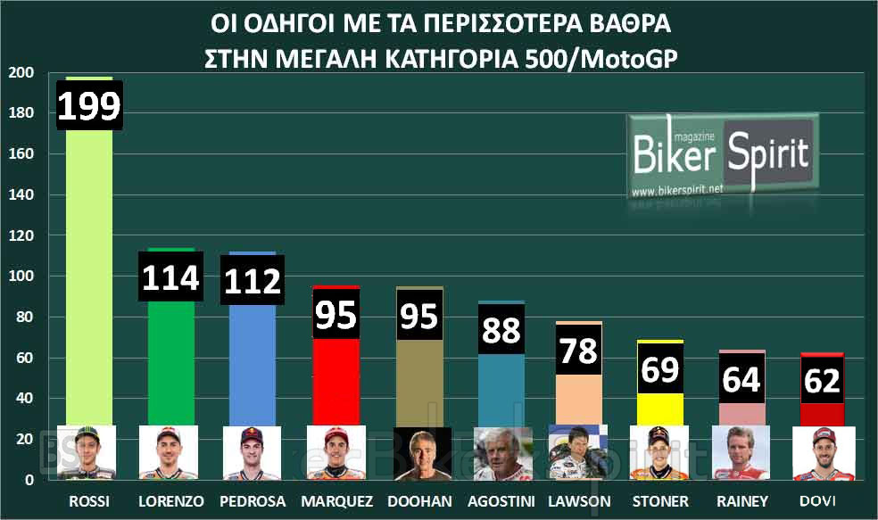 Κλείνοντας αυτή την λίστα να πούμε πως μόνο δυο οδηγοί μπορούν αυτή την στιγμή να αυξήσουν τα βάθρα τους αφού είναι και οι μόνοι ενεργοί στους αγώνες, ο Valentino Rossi και ο Marc Marquez!