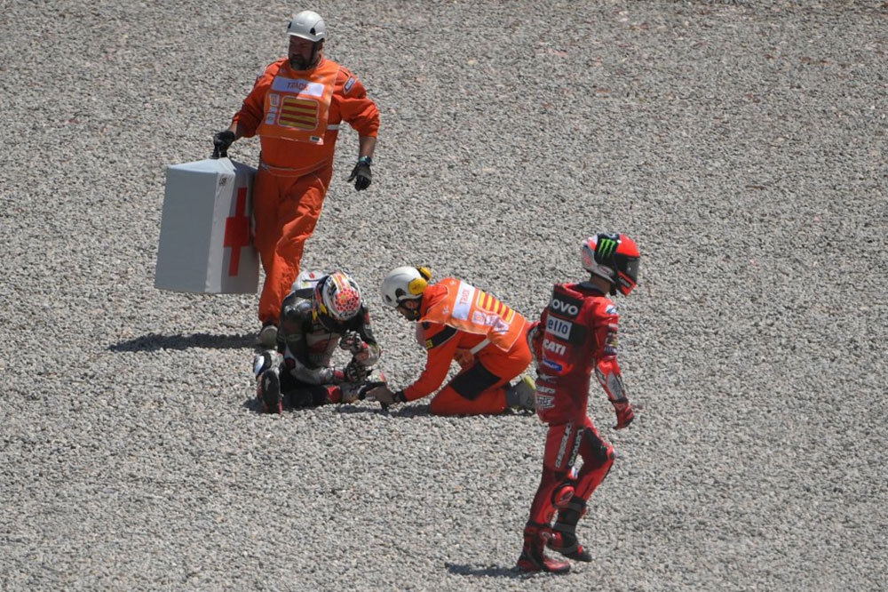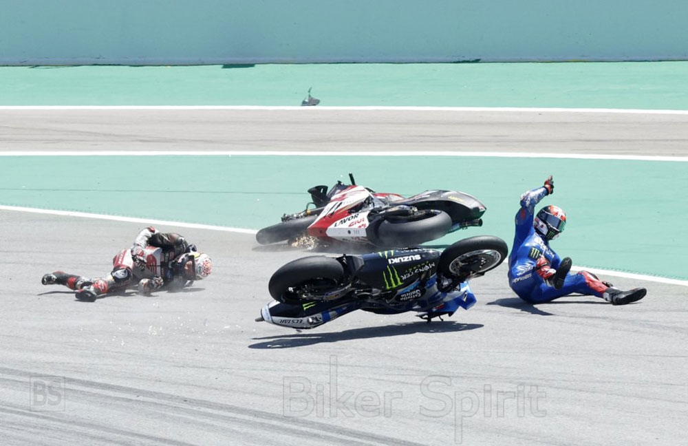 Ο Ιάπωνας χτύπησε με το κεφάλι τον πίσω τροχό του Pecco Bagnaia, ενώ η μηχανή του χτύπησε την Suzuki του Alex Rins, με αποτέλεσμα να βρεθούνε όλοι πεσμένοι!