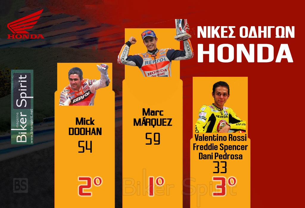 Ο Marc Márquez είναι ο αναβάτης με τις περισσότερες νίκες στο MotoGP με τη Honda . Μαζί με τον Marquez, στη λίστα εμφανίζονται οι Freddie Spencer, Dani Pedrosa και Valentino Rossi, οι οποίοι συγκέντρωσαν 33 νίκες με τη μάρκα Golden wing. Αλλά ο Márquez έχει 59 νίκες με τη Honda, πέντε περισσότερες από τον Mick Doohan, τον πιο επιτυχημένο αναβάτη της μάρκας μέχρι την άφιξη του Marquez.