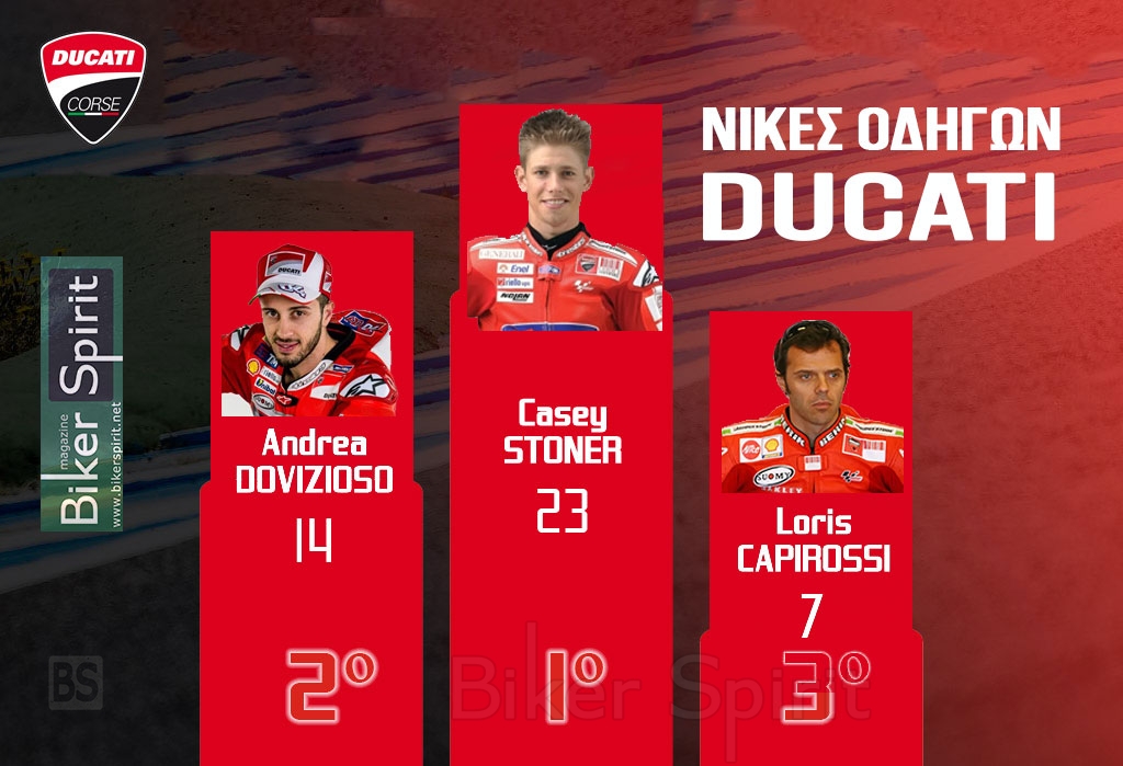 Στην Ducati, πολλοί ήταν οι αναβάτες που συνέβαλαν στο ιταλικό εργοστάσιο να έχει 58 νίκες στο MotoGP. Ο Jorge Martin ήταν ένας από τους τελευταίους που μπήκε στην λίστα, αλλά δίπλα του βρίσκονται ονόματα όπως οι Andrea Iannone, Troy Bayliss, Jack Miller, Danilo Petrucci, Jorge Lorenzo, Pecco Bagnaia και Loris Capirossi . Ωστόσο, δύο ήταν οι αναβάτες που έδωσαν τις περισσότερες νίκες και χαρές σε αυτούς του Borgo Panigale: ο Casey Stoner και ο Andrea Dovizioso.