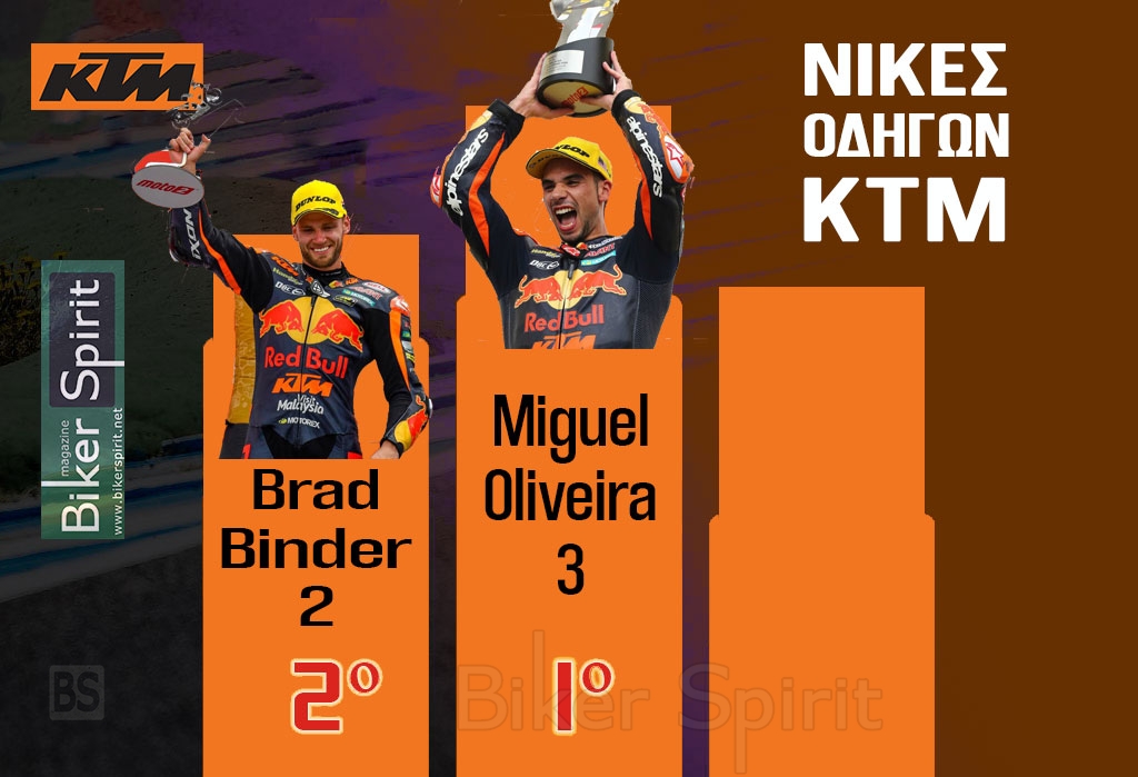 Η KTM είναι η τελευταία που εντάχθηκε σε αυτό το επιλεγμένο κλαμπ με νίκες στην κορυφαία κατηγορία . Το αυστριακό εργοστάσιο άρχισε να σκοράρει μερικά βάθρα με τον Pol Espargaro το 2018. Ωστόσο, η νίκη ήταν κάτι που του αντιστάθηκε μέχρι που ο Brad Binder την πέτυχε στο Grand Prix της Τσεχίας το 2020. Ο Binder επέστρεψε για να ανέβει στην κορυφή του βάθρου στο Grand Prix Αυστρίας τη σεζόν του 2021. Ωστόσο, ο Νοτιοαφρικανός δεν είναι ο αναβάτης της KTM με τις περισσότερες νίκες: αυτή η τιμή πηγαίνει στον Miguel Oliveira .