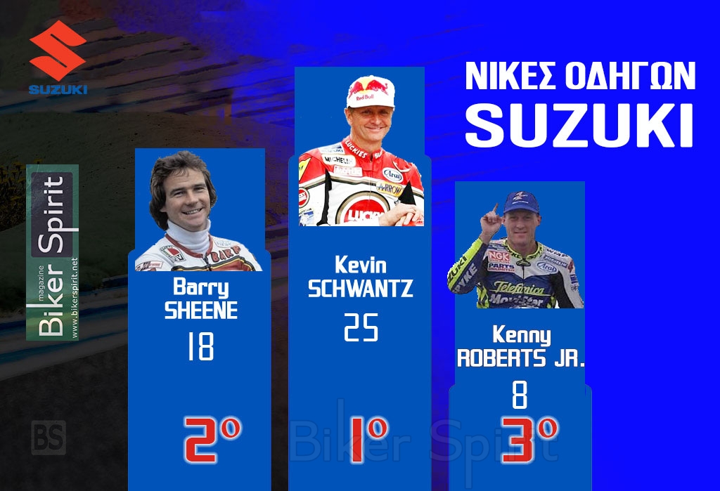 Στις νίκες της Suzuki στην κορυφαία κατηγορία , εμφανίζονται ονόματα όπως οι Joan Mir, Alex Rins, Franco Uncini, Randy Mamola, Wil Hartog ή Marco Lucchinelli . Αλλά άλλα ονόματα έρχονται στο μυαλό όταν σκεφτόμαστε το μεγαλείο του εργοστασίου του Hamamatsu: Barry Sheene, Kevin Schwantz και Kenny Roberts Jr . Όλοι είναι θρύλοι του MotoGP. Όλοι τους Παγκόσμιοι Πρωταθλητές με τη Suzuki. Αλλά ποιος ήταν αυτός που χάρισε τις περισσότερες νίκες στους Ιάπωνες;