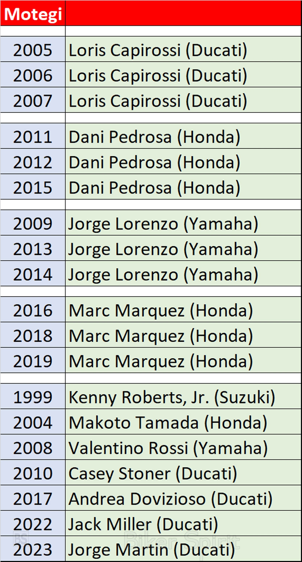 Τις περισσότερες νίκες στο Motegi τις έχουν οι Marc Márquez, Dani Pedrosa, Jorge Lorenzo και Loris Capirossi, με τρεις νίκες ο καθένας.