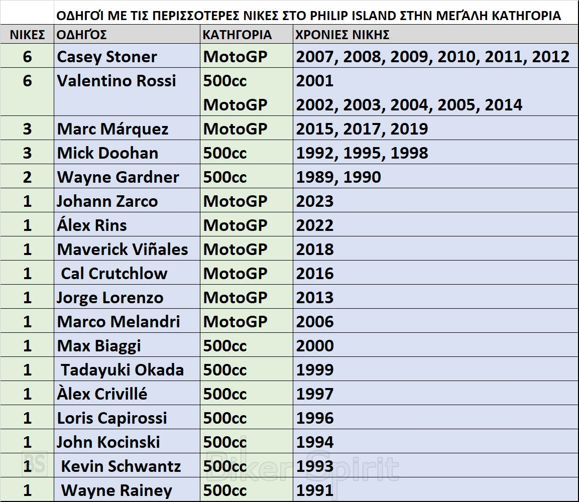 Οι οδηγοί με τις περισσότερες νίκες MotoGP στο Philip Island