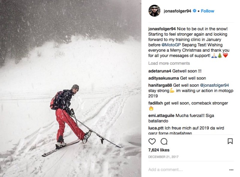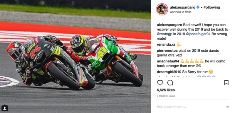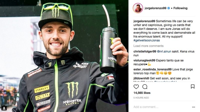 Για παράδειγμα, ο Jorge Lorenzo έγραψε: “Μερικές φορές η ζωή μπορεί να είναι πολύ άδικη και απρόβλεπτη, μας «μοιράζει» χαρτιά που δεν τα αξίζουμε, είμαι βέβαιος ότι ο Jonas Folger θα κάνει οτιδήποτε για να επιστρέψει και τότε θα δείξει σε όλους το τεράστιο ταλέντο του. Έχεις όλη μου την υποστήριξη! ”
