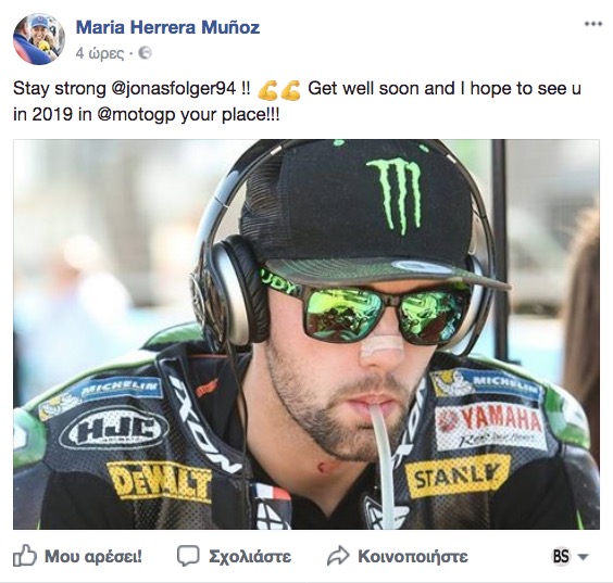 Η πρώην οδηγός GP, Maria Herrera, έγραψε στο Facebook: “Μείνε δυνατός, Jonas. Ελπίζω να σε δω στο MotoGP το 2019, όπου ανήκεις.