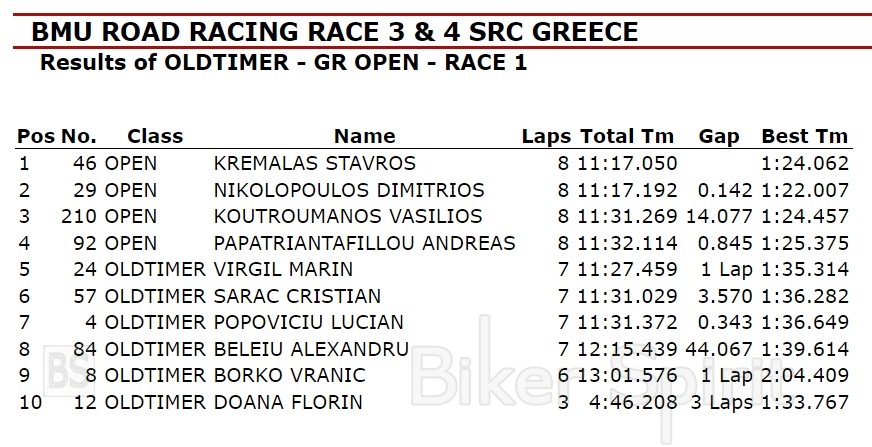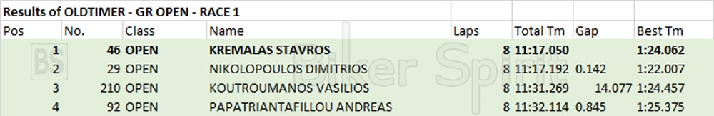 Στην δεύτερη θέση τερμάτισε ο Δημήτρης Νικολόπουλος, με διαφορά μόλις 0.142s, ενώ σημείωσε και τον ταχύτερο γύρο του αγώνα με χρόνο 1:22.007.