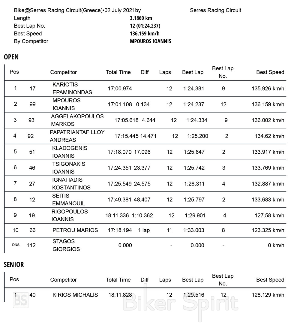 Στην 9η θέση τερμάτισε ο Γιάννης Ρηγόπουλος (KAWASAKI ZX6R 600), μπροστά από τον Μιχάλη Κύριο (YAMAHA R1) της κατηγορίας SENIOR, και τον Μάριο Πέτρου (HONDA CBR 600).