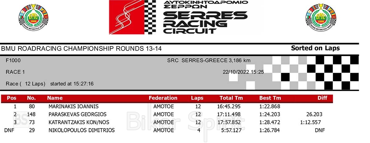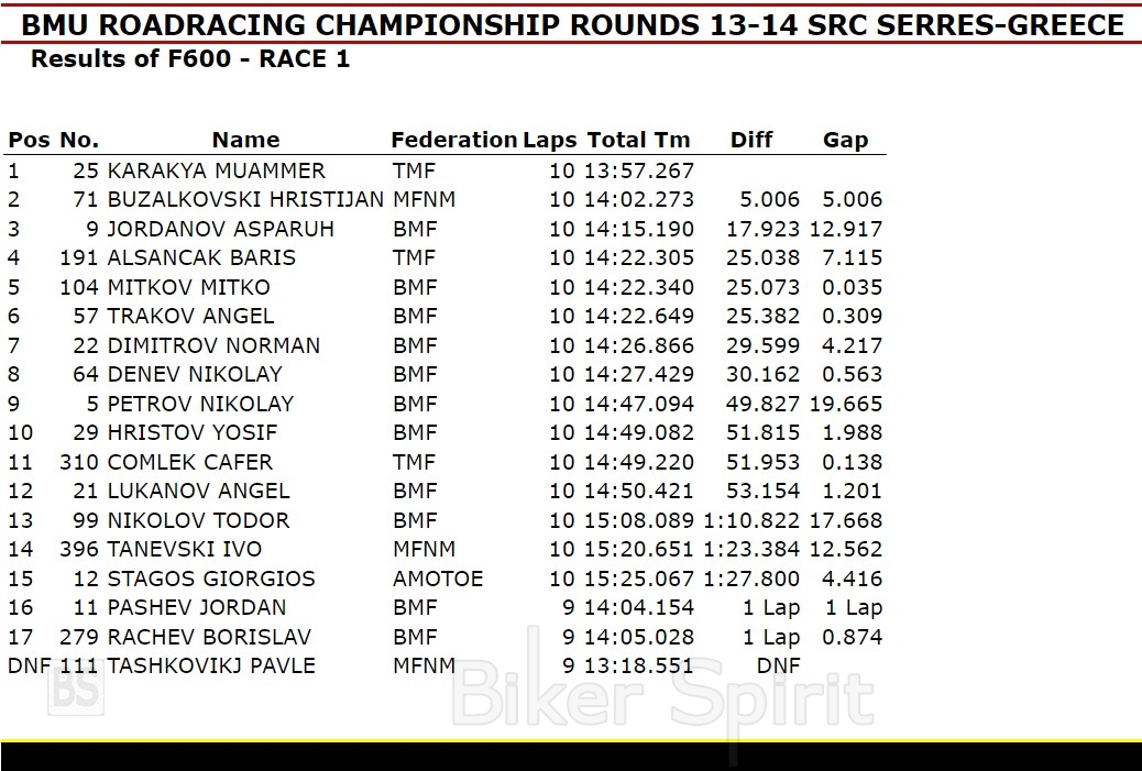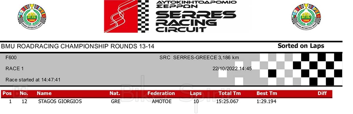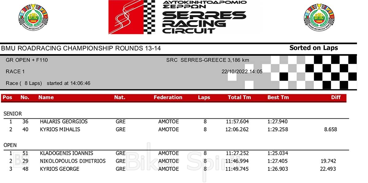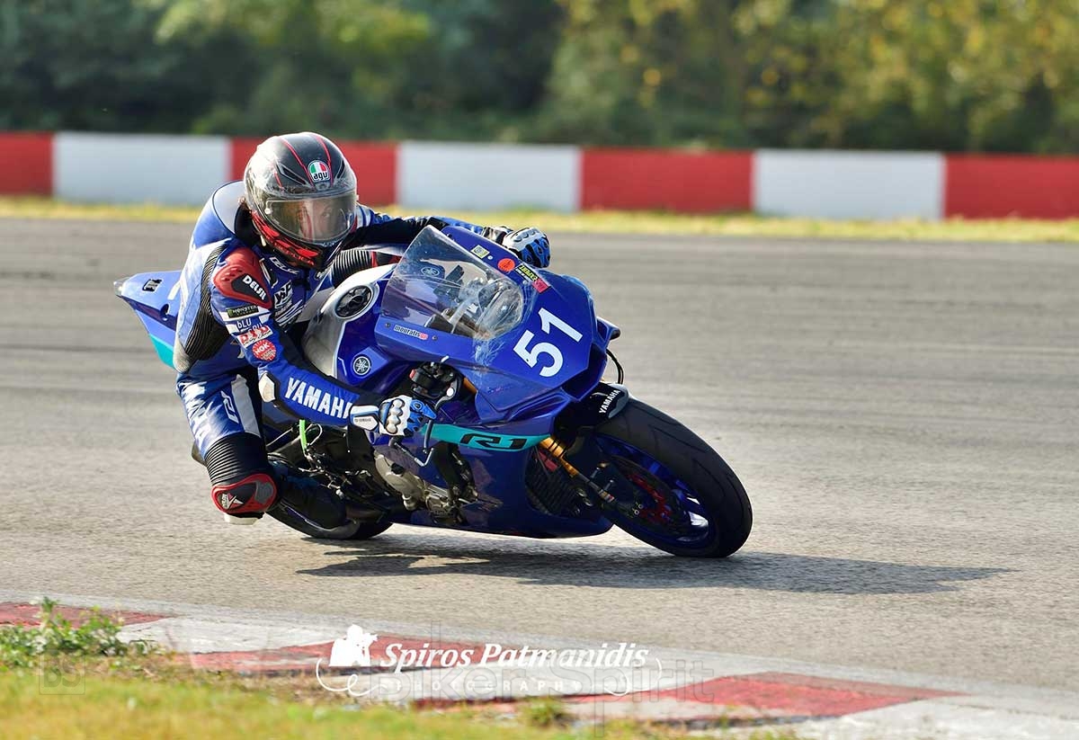 Στην 4η θέση του αγώνα και την 1η της κατηγορίας SENIOR τερμάτισε ο Γιώργος Χάλαρης (KAWASAKI ZX6R 600), μπροστά από τον Μιχάλη Κύριο (YAMAHA R1), που έκλεισε και την 5αδα του αγώνα!