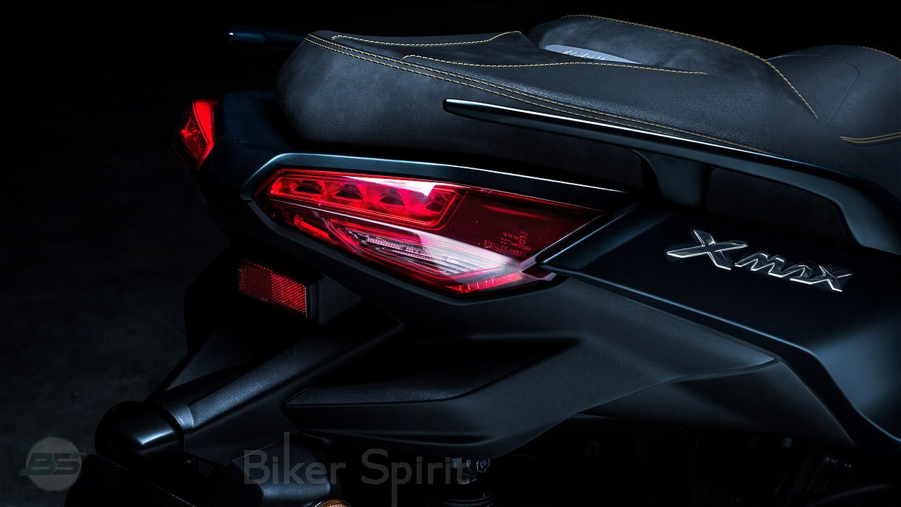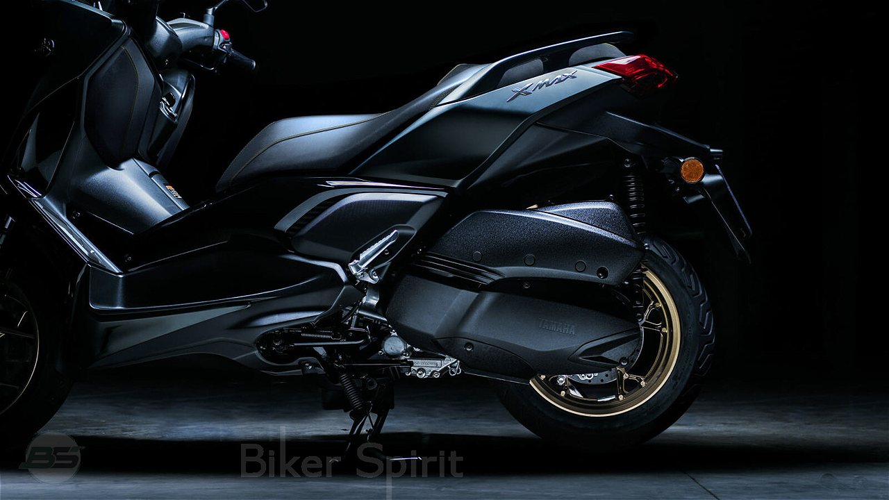 Στην αριστερή πλευρά του σκούτερ, το νέας εμφάνισης, τρισδιάστατο μπούμερανγκ παρέχει μια ομαλή και ισχυρή οπτική ροή, από το ψαλίδι μέχρι το εμπρός μέρος της σέλας και τον άξονα του μπροστινού τροχού, δημιουργώντας μια αρμονική αύνδεση που εντυπωσιάζει. Το ίδιο ισχύει και στη δεξιά πλευρά, όπου το μπούμερανγκ παρέχει αδιάκοπη ροή από το τελικό της εξάτμισης έως τον μπροστινό τροχό, προσφέροντας μια συμμετρία που υπογραμμίζει την premium εμφάνιση και την υψηλή ποιότητα του νέου XMAX 300 Tech MAX.