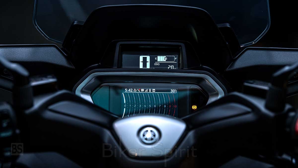 Το XMAX 300 Tech MAX είναι εξοπλισμένο με έναν από τους πιο εντυπωσιακούς πίνακες οργάνων που μπορείτε να βρείτε σε οποιοδήποτε Sport Scooter. Αυτά τα ολοκληρωμένα όργανα περιλαμβάνουν μια νέα, προηγμένη έγχρωμη οθόνη infotainment TFT 4,2 ιντσών, η οποία συνδέεται με smartphone και μπορεί να λειτουργήσει ως ενσωματωμένο σύστημα πλοήγησης.