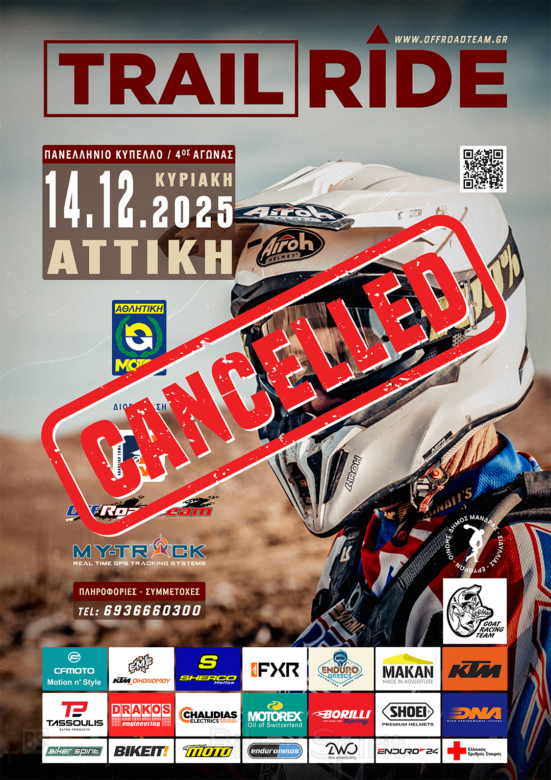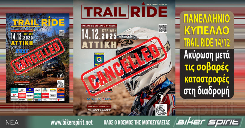 “Μετά λύπης μας σας ενημερώνουμε ότι οι τελευταίες κακοκαιρίες που έπληξαν την περιοχή της Μάνδρας, των Μεγάρων και της Νέας Περάμου, καθιστούν αδύνατη την πραγματοποίηση του Trail Ride στις 14/12, τόσο για τα αυτοκίνητα όσο και για τις μοτοσικλέτες.