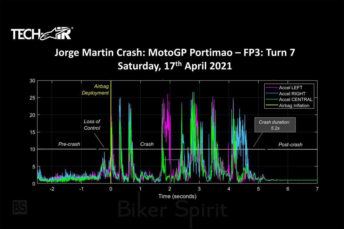 Συνολικά, η συντριβή του Martin διήρκεσε 5,2 δευτερόλεπτα από το πρώτο άνοιγμα του αερόσακου Alpinestars, όταν έπεσε. Αυτή η διάρκεια καθιστά την πτώση μια από τις μεγαλύτερες. Ο Marc Marquez (Repsol Honda Team) στην πτώση του στο Ισπανικό Grand Prix το 2020 είχε διάρκεια 3,5 δευτερόλεπτα.