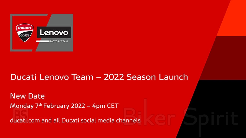 Επομένως, η παρουσίαση της Ducati Lenovo Team 2022, που είχε αρχικά προγραμματιστεί για τις 28 Ιανουαρίου, θα αναβληθεί για τις 7 Φεβρουαρίου 2022.”