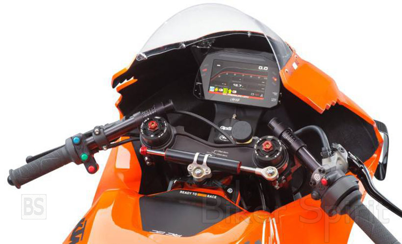 Εξασφαλίζοντας ότι τα δεδομένα συλλέγονται και ταξινομούνται, το KTM RC 8C χρησιμοποιεί τον πίνακα ελέγχου AIM MXS 1.2 RACE και το καταγραφικό δεδομένων με ενσωματωμένη λειτουργία GPS. Όλες οι πληροφορίες εμφανίζονται μέσω οθόνης TFT 5 “με ενσωματωμένη εγγραφή δεδομένων, η οποία καταγράφεται συνεχώς και μπορεί να αναλυθεί στο AIM Race Studio.