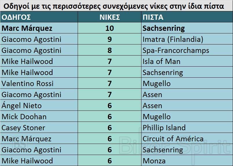 Να θυμίσουμε πως ο Marquez επίσης κατέχει το απόλυτο ρεκόρ σε όλη τη διάρκεια του πρωταθλήματος, το όποιο ξεκίνησε πριν από 72 χρόνια, του οδηγού που έχει επιτύχει 10 συνεχόμενες νίκες στην ίδια πίστα!