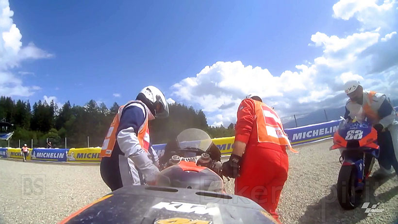 Ο Pol Espargaro δεν ήταν ποτέ τυχερός στο Spielberg: το 2017 έπεσε με τον Hector Barbera, το 2018 έχασε την προθέρμανση του Μπρνο μετά την πτώση του, η οποία είχε ως αποτέλεσμα τραυματισμό στο ώμο και το 2019 είχε μια βλάβη του κινητήρα στο RC16 του. Φέτος έπεσε σε ένα περιστατικό με τον οδηγό της KTM, Miguel Oliveira, αφού έπρεπε να οδηγήσει πάλι με μια ανοικτή γραμμή, έπειτα έκλεισε την γραμμή του και συγκρούστηκε με τον Πορτογάλο με αποτέλεσμα να πέσουν και οι δυο.