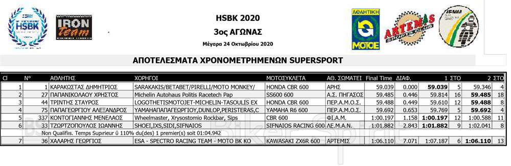 Ο Δημήτρης Καρακώστας συνεχίζει την φοβερή του πορεία και κερδίζει και την δεύτερη διπλή pole position στην κατηγορία Supersport, με χρόνο 0:59.039, μπροστά από τον rookie Χρήστο Παπανικολάου που έγραψε χρόνο 59.485, φανερά βελτιωμένος από τον προηγούμενο διπλό αγώνα.