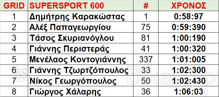 Ο Δημήτρης Καρακώστας συνεχίζει την φοβερή του πορεία και κερδίζει και την δεύτερη διπλή pole position στην κατηγορία Supersport, με χρόνο 0:58.97, μπροστά από τον Αλέξ Παπαγεωργίου που έγραψε χρόνο 59.390.