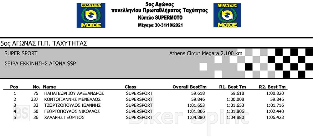 Την pole position στην κατηγορία Supersport, με χρόνο 59.618, κέρδισε ο Αλέξ Παπαγεωργίου , μπροστά από τον Μενέλαο Κοντογιάννη που έγραψε χρόνο 59.846, που είναι πολύ κοντά στο ατομικό του ρεκόρ!.