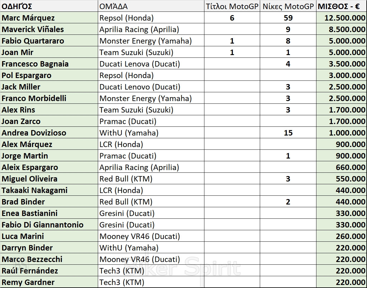 Οι μισθοί των οδηγών του MotoGP είναι σίγουρα κατά προσέγγιση και σύμφωνα με τις πληροφορίες, μιας και επίσημος κατάλογος δεν είναι γνωστός.