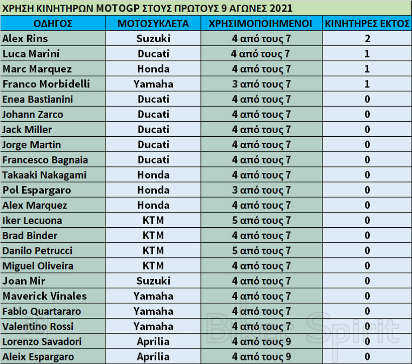 Όπως δείχνει η ακόλουθη λίστα παρακάτω, οι περισσότεροι αναβάτες του MotoGP έχουν χρησιμοποιήσει 4 από τους 7 κινητήρες τους για αυτή τη σεζόν, με τον Pol Espargaro (Repsol Honda) και τον τραυματισμένο Franco Morbidelli (Petronas Yamaha) να έχουν χρησιμοποιήσει μόνο 3 κινητήρες στους 9 αγώνες.