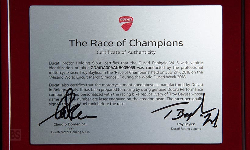 Το πιστοποιητικό γνησιότητας , υπογεγραμμένο από τον Claudio Domenicali, Διευθύνοντα Σύμβουλο της Ducati Motor Holding, θα δώσει την προστιθέμενη αξία αγοράς.