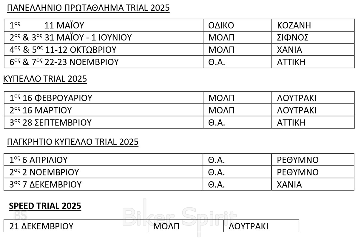 Η Αθλητική ΜΟΤΟΕ προκηρύσσει για το 2025, Πανελλήνιο Πρωτάθλημα Trial, Κύπελλο Trial και Παγκρήτιο Κύπελλο Trial, καθώς και μεμονωμένο αγώνα Speed Trial