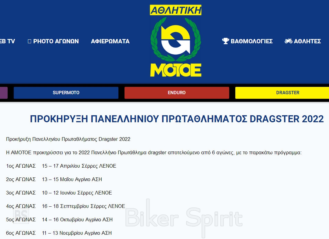 Η ΑΜΟΤΟΕ προκηρύσσει για το 2022 Πανελλήνιο Πρωτάθλημα dragster αποτελούμενο από 6 αγώνες, με το παρακάτω πρόγραμμα: