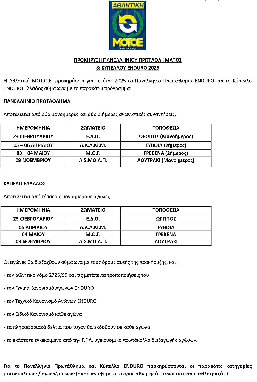Η Αθλητική ΜΟΤ.Ο.Ε. προκηρύσσει για το έτος 2025 το Πανελλήνιο Πρωτάθλημα ENDURO και το Κύπελλο ENDURO Ελλάδος σύμφωνα με το παρακάτω πρόγραμμα: