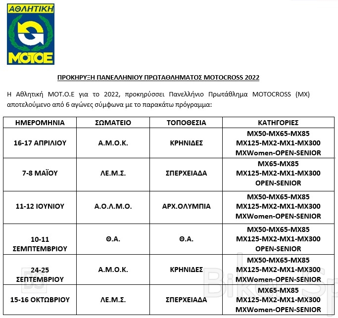Η Αθλητική ΜΟΤ.Ο.Ε προκήρυξε το Πανελλήνιο Πρωτάθλημα Motocross (ΜΧ) για το 2022 αποτελούμενο από 6 αγώνες.