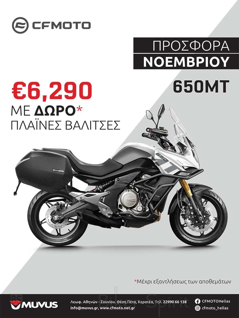 Η CFMOTO Hellas προσφέρει για το μήνα Νοέμβριο, την 650MT στην τιμή των 6.290€ με δώρο πλαϊνές βαλίτσες!!!