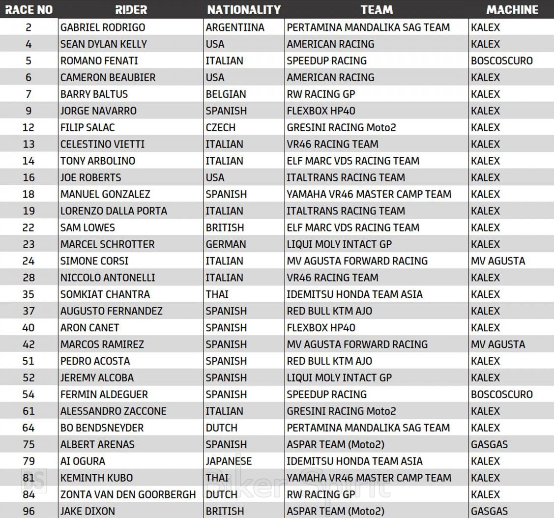 Μια νέα ομάδα θα κάνει το ντεμπούτο της στο Grand Prix στο Moto2™ την επόμενη σεζόν, η Yamaha VR46 Master Camp Team, με τους rookies Manuel Gonzalez και Keminth Kubo. Έξι αναβάτες μετακινούνται από το Moto3™ στο Moto2™ το 2022, μεταξύ των οποίων ο Gabriel Rodrigo, ο Romano Fenati, ο Filip Salač, ο Niccolo Antonelli, ο Παγκόσμιος Πρωταθλητής Moto3™ Pedro Acosta και ο Jeremy Alcoba. Επιπλέον, τρεις άλλοι rookies ενώνονται με τους Gonzales και Kubo: Sean Dylan Kelly, Alessandro Zaccone και Zonta van den Goorbergh.
