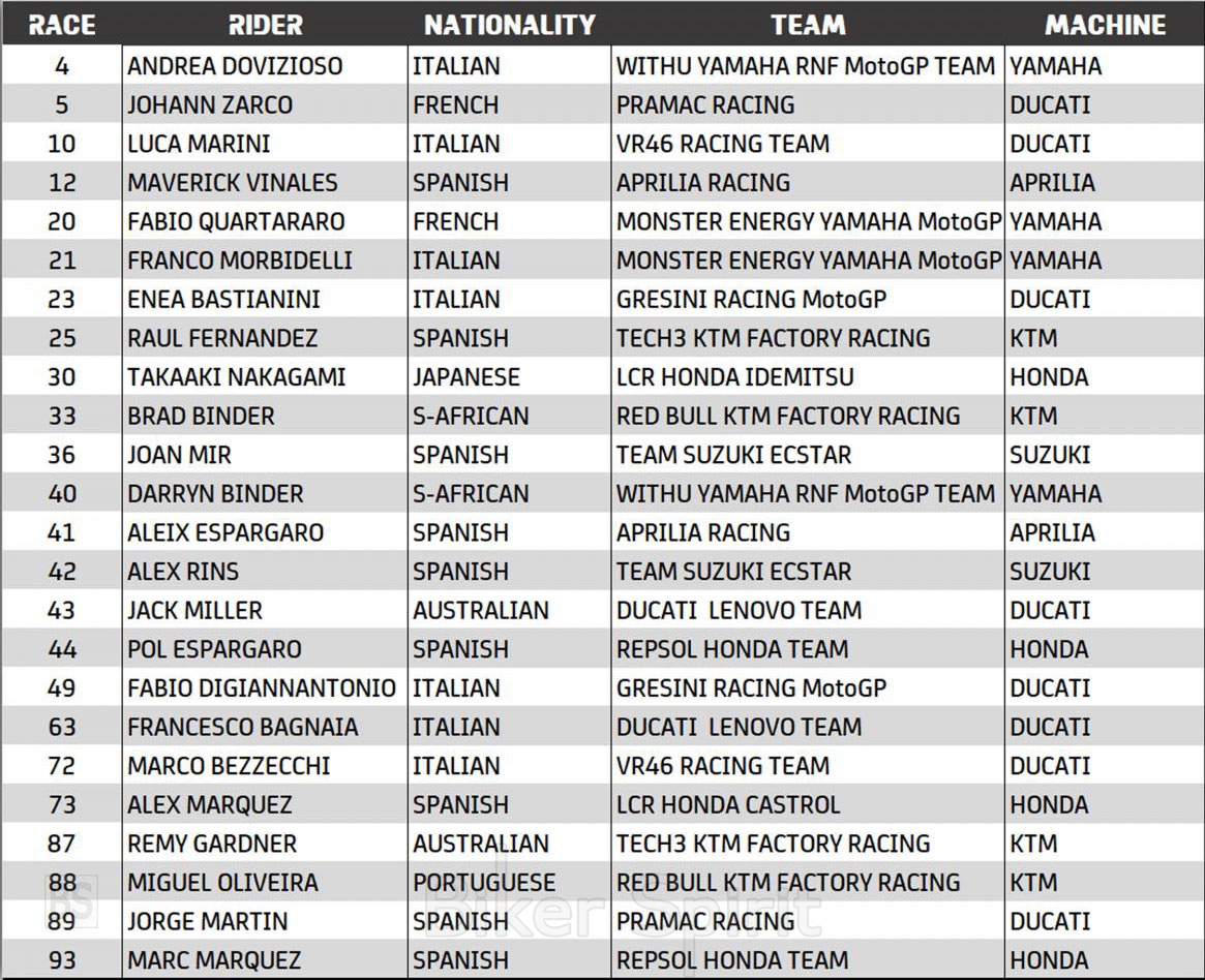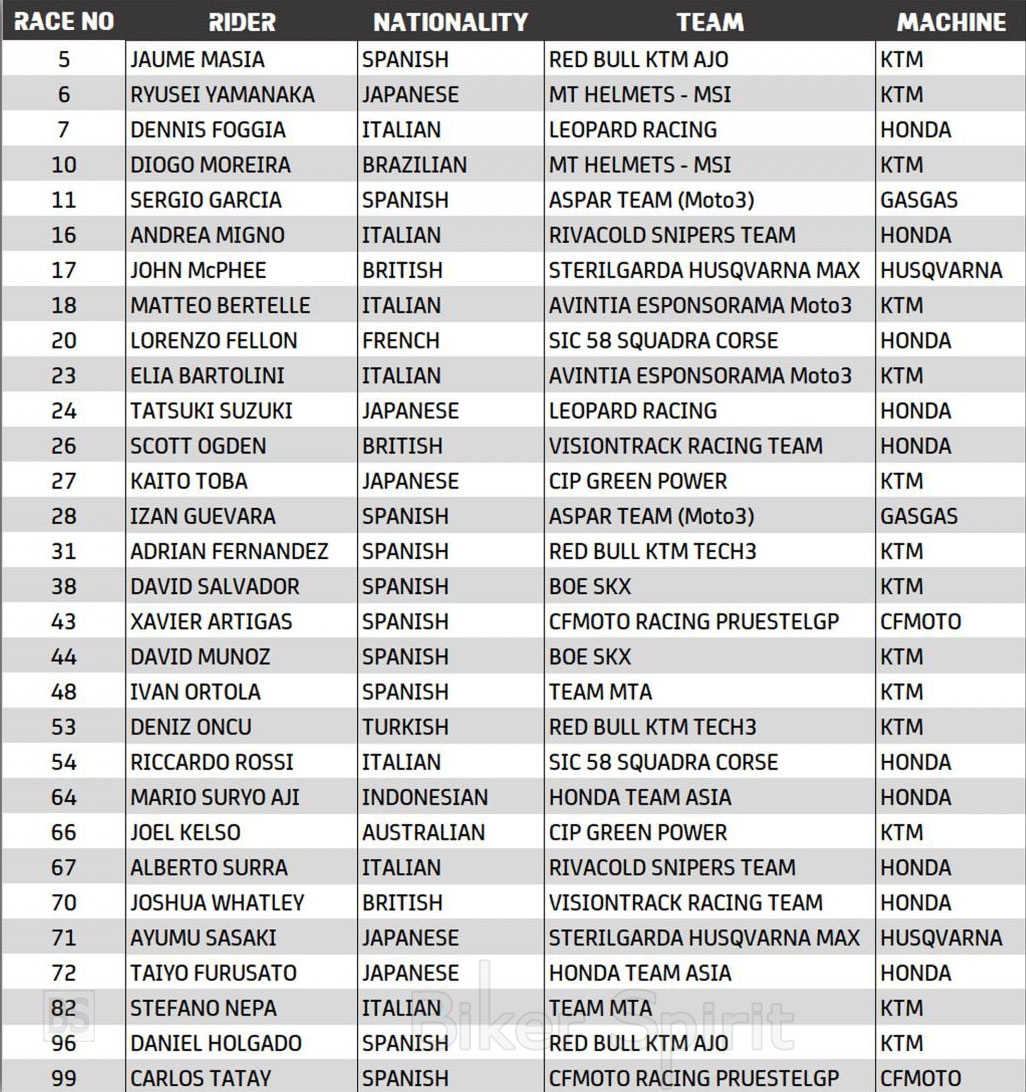Προσωρινές λίστες συμμετοχών των MotoGP, Moto2 και Moto3 για το 2022