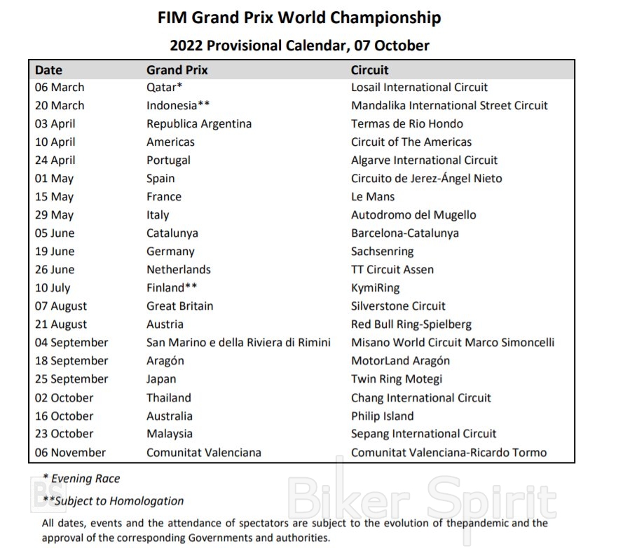 Κυκλοφόρησε το ημερολόγιο του Παγκόσμιου Πρωταθλήματος FIM MotoGP για το 2022, το οποίο αποτελείται από 21 γύρους από τον Μάρτιο έως τον Νοέμβριο που περιλαμβάνουν επισκέψεις σε δύο νέες πίστες στην Ινδονησία και τη Φινλανδία.