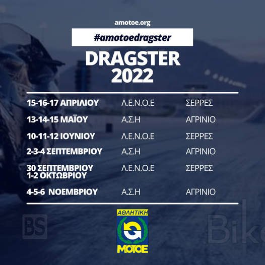 Dragster 2021 Προσωρινό Πρόγραμμα Πανελληνίου Πρωταθλήματος DRAGSTER 2022 12 December 2021 BikerSpirit Dragster, Dragster 2022, Πρόγραμμα 0 min read To Διοικητικό Συμβούλιο της Α.ΜΟΤ.Ο.Ε σε συνεργασία με την Επιτροπή Dragster, παρουσιάζουν το προσωρινό πρόγραμμα για το Πανελλήνιο Πρωτάθλημα 2022. ΠΡΟΣΩΡΙΝΟ ΠΡΟΓΡΑΜΜΑ ΠΑΝΕΛΛΗΝΙΟΥ ΠΡΩΤΑΘΛΗΜΑΤΟΣ DRAGSTER 2022 ΗΜΕΡΟΜΗΝΙΑ ΣΩΜΑΤΕΙΟ ΤΟΠΟΘΕΣΙΑ 15-16-17 ΑΠΡΙΛΙΟΥ Λ.Ε.Ν.Ο.Ε ΣΕΡΡΕΣ 13-14-15 ΜΑΪΟΥ Α.Σ.Η ΑΓΡΙΝΙΟ 10-11-12 ΙΟΥΝΙΟΥ Λ.Ε.Ν.Ο.Ε ΣΕΡΡΕΣ 2-3-4 ΣΕΜΠΤΕΜΒΡΙΟΥ Α.Σ.Η ΑΓΡΙΝΙΟ 30 ΣΕΠΤΕΜΒΡΙΟΥ-1-2 ΟΚΤΩΒΡΙΟΥ Λ.Ε.Ν.Ο.Ε ΣΕΡΡΕΣ 4-5-6 ΝΟΕΜΒΡΙΟΥ Α.Σ.Η ΑΓΡΙΝΙΟ Randomizer Related Posts Αγώνας μοτοσυκλετών DRAGSTER, στις 16-17 Οκτωβρίου 2021 στο Αυτοκινητοδρόμιο Σερρών και Προπόνηση 15/10/2021 Διαγραφή από την ΑΜΟΤΟΕ στελεχών DRAGSTER μετά από καταδικαστική απόφαση για το θανατηφόρο ατύχημα του Νίκου Μπερδέ ΑΠΟΤΕΛΕΣΜΑΤΑ 3ου Αγώνα Πρωταθλήματος Μοτοσυκλετών DRAGSTER 2021 – Αυτοκινητοδρόμιο Σερρών ΣΥΜΜΕΤΟΧΕΣ 3ου Αγώνα Πρωταθλήματος Μοτοσυκλετών DRAGSTER 2021 – Αυτοκινητοδρόμιο Σερρών 3ος Πρωταθληματικός Αγώνας Μοτοσυκλετών DRAGSTER, 9 -10 – 11 Ιουλίου 2021 στο Αυτοκινητοδρόμιο Σερρών – Ειδικός Κανονισμός – Πρόγραμμα 2ος Αγώνας μοτοσυκλετών DRAGSTER, στις 5 – 6 Ιουνίου 2021 στο Αυτοκινητοδρόμιο Σερρών και Προπόνηση 4/6/2021 Share this: Share on Facebook (Opens in new window) Facebook Share on X (Opens in new window) X Share on LinkedIn (Opens in new window) LinkedIn Print (Opens in new window) Print More Share on Reddit (Opens in new window) Reddit Share on Tumblr (Opens in new window) Tumblr Share on Pinterest (Opens in new window) Pinterest Related