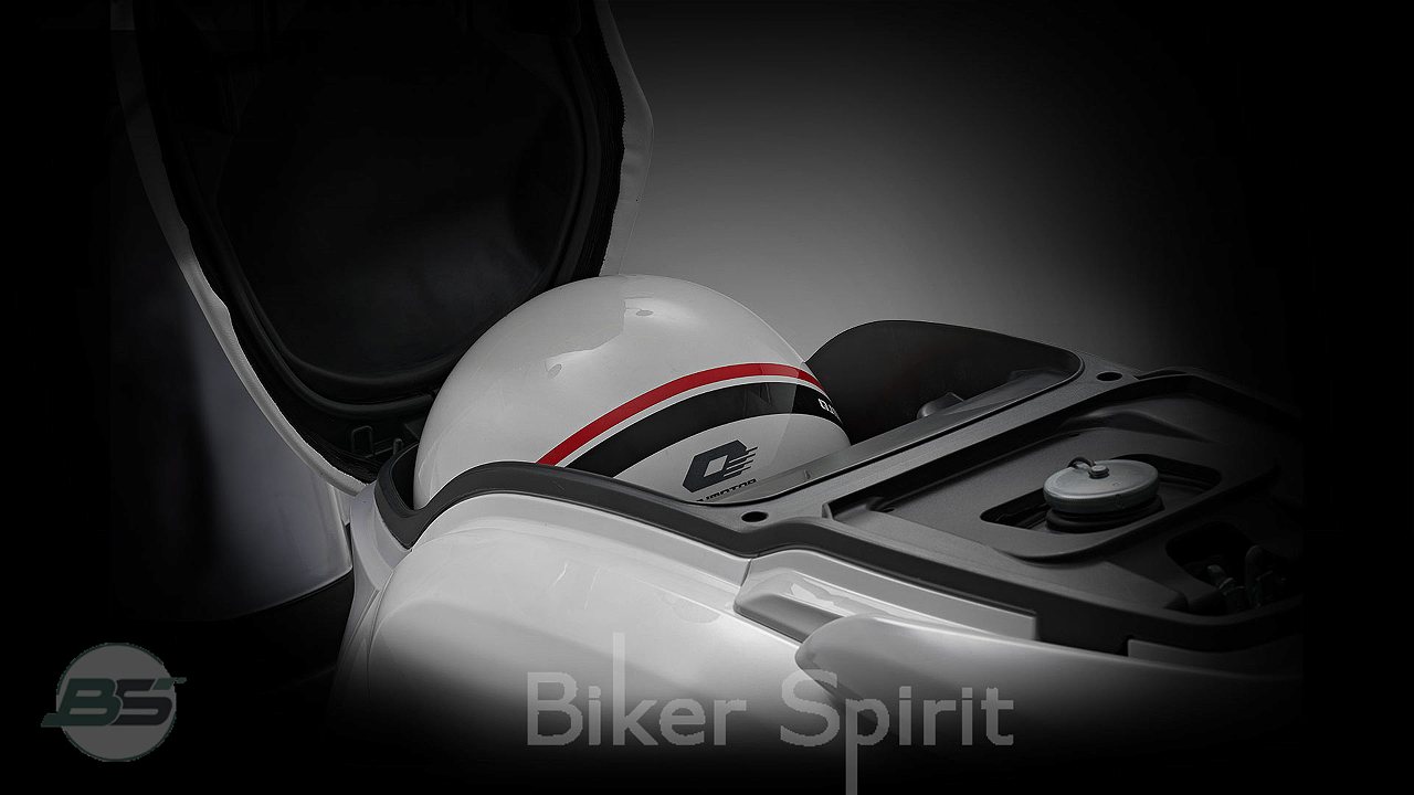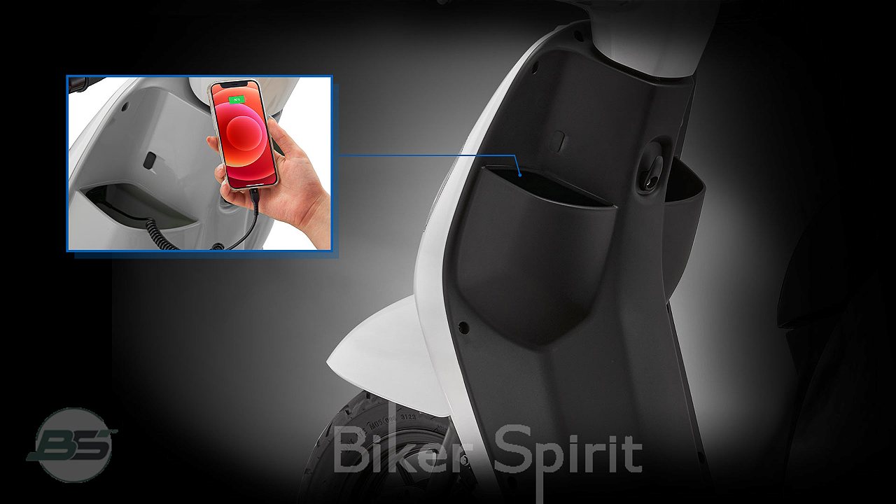 Οι δύο μεγάλου μεγέθους θήκες στην ποδιά για μικροαντικείμενα και η θύρα φόρτισης USB με τον πρακτικό γάντζο, προσφέρουν λύσεις για τις ανάγκες της καθημερινής μετακίνησης στις σύγχρονες πόλεις. Εξίσου μεγάλος είναι ο κλειστός αποθηκευτικός χώρος κάτω από τη σέλα που φιλοξενεί ένα κράνος και επιπλέον μικροαντικείμενα, όπως γάντια και αδιάβροχα.