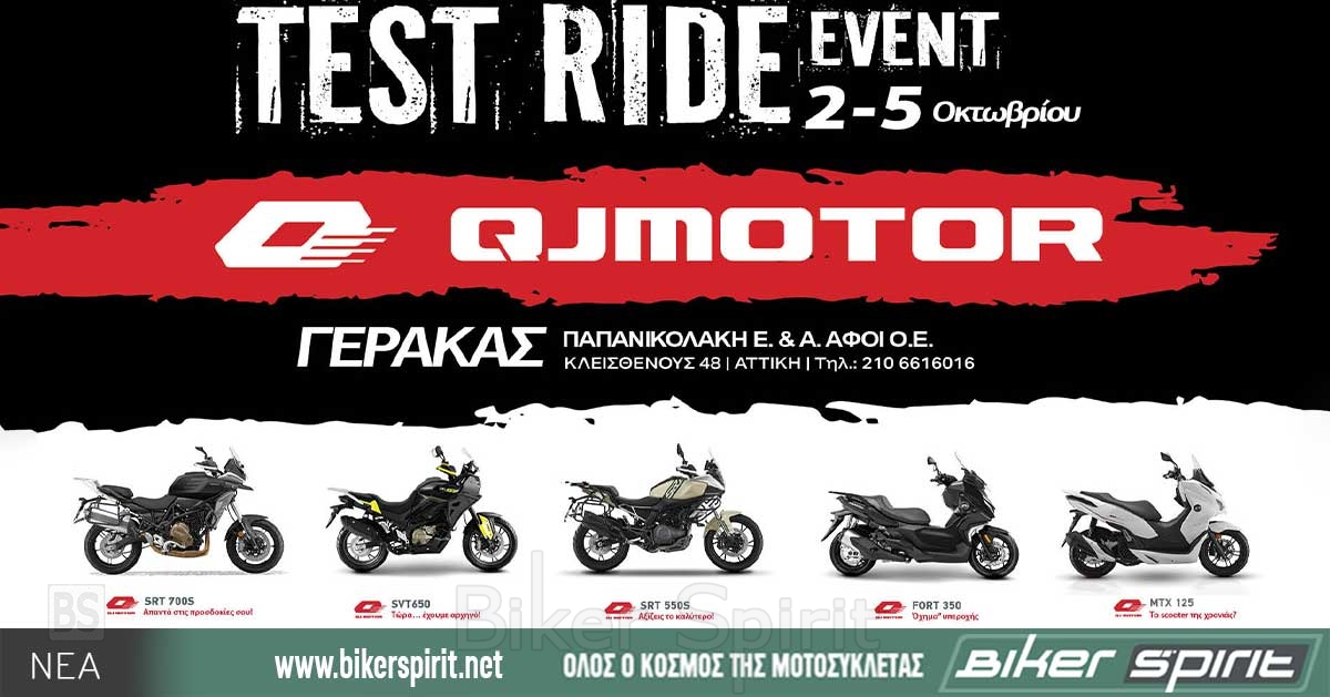 To QJMOTOR PREMIUM TEST RIDE TOUR θα βρίσκεται στο κατάστημα ΠΑΠΑΝΙΚΟΛΑΚΗΣ ΜΟΤΟ στο Γέρακα Αττικής από τις 2 Οκτωβρίου έως και τις 5 Οκτωβρίου για μια μοναδική εμπειρία οδήγησης των ολοκαίνουριων QJMOTOR SRT 550S & SRT 700S με τον πιο πλήρη εξοπλισμό άνεσης και τεχνολογίας στην κατηγορία τους, την SVT 650 με τον μοναδικό βελούδινο V2 κινητήρα, των εντυπωσιακών scooter FORT 350 και MTX 125 με την πρωτοποριακή τεχνολογία που συναρπάζει.