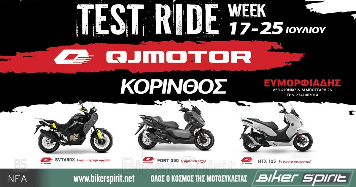 To TEST RIDE TOUR 2024 της QJMOTOR θα βρίσκεται στην πόλη της Κορίνθου από την Τετάρτη 17 Ιουλίου έως και την Πέμπτη 25 Ιουλίου και σας προσκαλεί σε μια μοναδική εμπειρία οδήγησης της QJMOTOR SVT 650X με τον βελούδινο V2 κινητήρα και των νέων scooter QJMOTOR FORT 350 και MTX 125 με την πρωτοποριακή τεχνολογία που συναρπάζει.