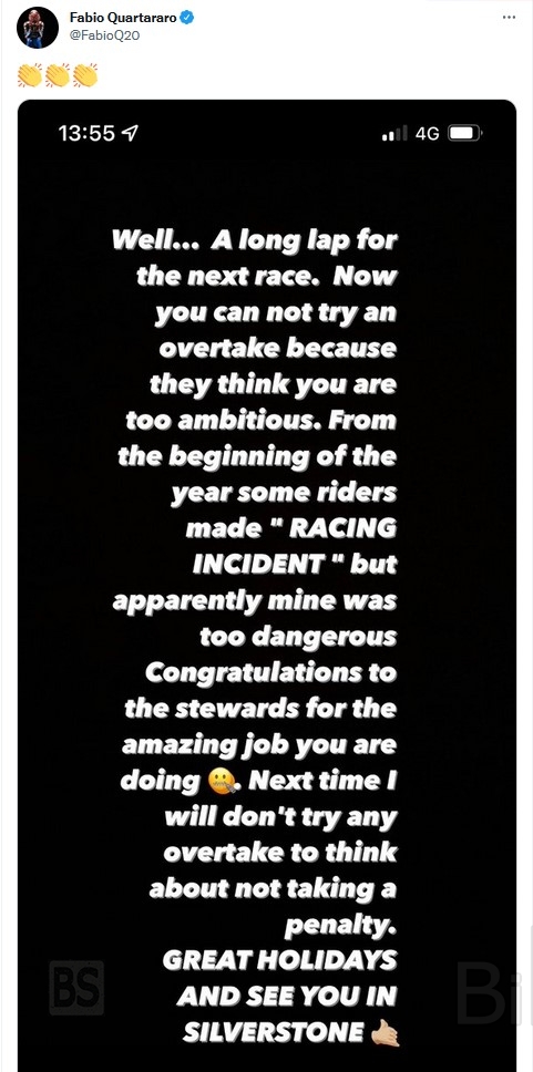 Εν τω μεταξύ, ο Quartararo χρησιμοποίησε τα κοινωνικά δίκτυα για να δείξει την διαφωνία του και τον “θυμό” του. «Λοιπόν, ένα “Long Lap Penalty” για τον επόμενο αγώνα. Τώρα δεν μπορείς να προσπαθήσεις να προσπεράσεις επειδή πιστεύουν ότι είστε πολύ φιλόδοξος. Από την αρχή της χρονιάς ορισμένοι οδηγοί είχαν “αγωνιστικά περιστατικά”, αλλά προφανώς το δικό μου ήταν πολύ επικίνδυνο “Συγχαρητήρια στους αγωνοδίκες για την απίστευτη δουλειά που κάνουν. Την επόμενη φορά δεν θα προσπαθήσω να προσπεράσω, οπότε δεν νομίζω ότι μπορεί να τιμωρηθώ . Καλές διακοπές σε όλους, τα λέμε στο Silverstone.»