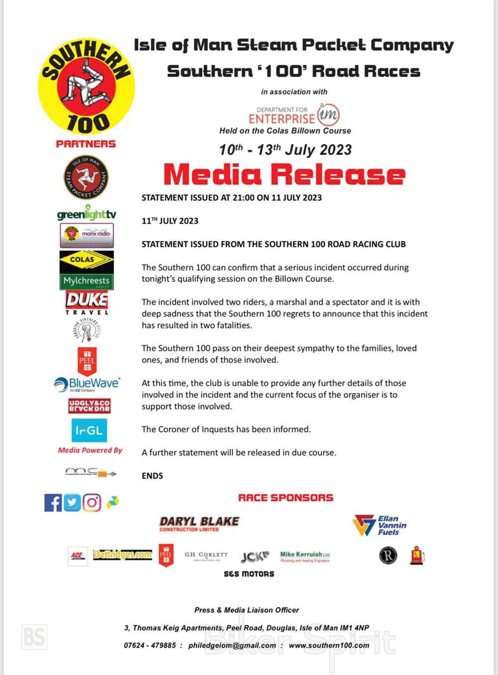 Η επίσημη δήλωση της διοργάνωσης αναφέρει: «Το Southern 100 επιβεβαιώνει ότι ένα σοβαρό περιστατικό σημειώθηκε κατά τη διάρκεια της αποψινής προκριματικής συνεδρίασης στο Billown Cour.
