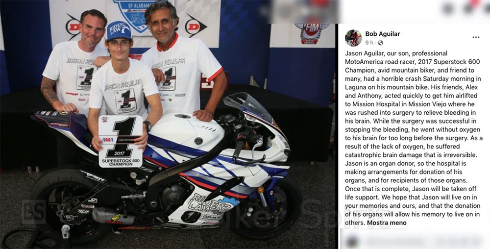 Αυτά είναι τα λόγια του πατέρα του οδηγού: «Ο Jason Aguilar, ο γιος μας, επαγγελματίας οδηγός αγώνων στο MotoAmerica, Πρωταθλητής του 2017 Superstock 600, μανιώδης ποδηλάτης βουνού και φίλος πολλών, είχε ένα φρικτό ατύχημα το πρωί του Σαββάτου στη Λαγκούνα με το ποδήλατο βουνού του. Οι φίλοι του, ο Αλεξ και ο Άντονι, έδρασαν γρήγορα για να τον μετέφεραν με αεροπλάνο στο Νοσοκομείο Mission στο Mission Viejo όπου εισήχθη εσπευσμένα σε χειρουργική επέμβαση για να ανακουφιστεί η αιμορραγία στον εγκέφαλό του. Έλλειψη οξυγόνου, υπέστη καταστροφική εγκεφαλική βλάβη που είναι μη αναστρέψιμη. Ο Jason είναι δότης οργάνων, επομένως το νοσοκομείο προβαίνει σε ρυθμίσεις για τη δωρεά των οργάνων του και για τους λήπτες αυτών των οργάνων. Μόλις ολοκληρωθεί, ο Jason θα αφαιρεθεί το σύστημα υποστήριξης ζωής Ελπίζουμε ότι ο Jason θα ζήσει στις αναμνήσεις σας και τις δικές μας για πάντα, και ότι η δωρεά των οργάνων του θα επιτρέψει να παραμείνει ζωντανός μέσα από τους άλλους».