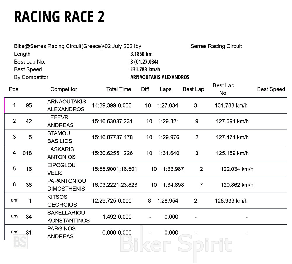 Ο Γιώργος Κίτσος (HONDA RSW 250) , νικητής του 1ου αγώνα, ξεκίνησε από την πρώτη θέση στην σχάρα, αλλά χρεώθηκε με άκυρη εκκίνηση και ποινή διέλευσης από τα pit. Στην συνέχεια και ενώ ήταν στην 7η θέση στον 8 γυρο εγκατέλειψε τον αγώνα!
