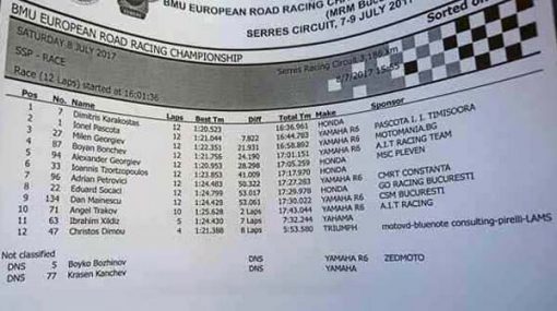 Οι 7 Έλληνες που συμμετείχαν στον 5ο γύρο για το Βαλκανικό Πρωτάθλημα Ταχύτητας στις Σέρρες που έγινε το Σαββατοκύριακο 8 και 9 Ιουλίου 2017, ήταν οι Γιώργος Μαρκεσσίνης και Σωτήρης Μπεγνής στην κατηγορία Superbike, ο Δημήτρης Καρακώστας, ο Χρήστος Δήμου και ο Γιάννης Τζωρτζόπουλος στην κατηγορία Supersport, ο Λάζος Πετίδης στην κατηγορία F1000 και ο Αλέξανδρος Αργυρόπουλος στην κατηγορία F600.